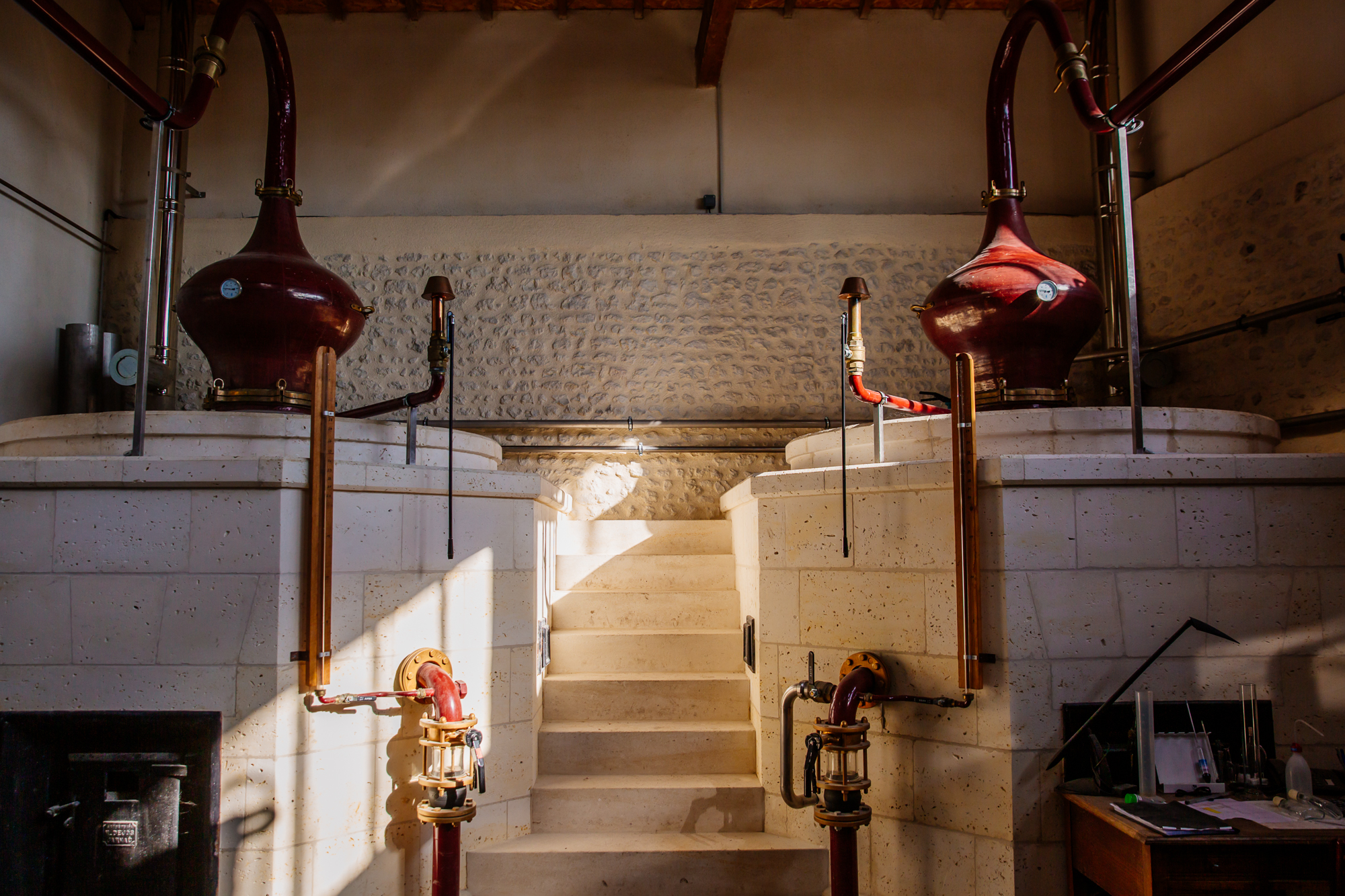 This is how we find ourselves in the distillery where the majestic alembic stands. We pay particular attention to the double distillation process, which is essential to making the finest Cognacs.